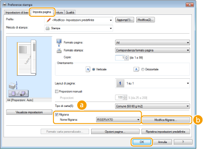 Scheda [Imposta pagina] Selezionare la casella di controllo [Filigrana] Selezionare una filigrana da [Nome filigrana] [OK]