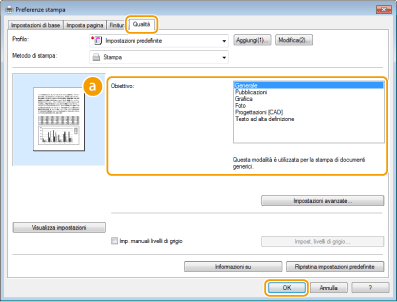 Selezionare un'opzione in base al tipo di documento o allo scopo di stampa. Ad esempio, selezionare [Generale] per uso generico, oppure [Foto] quando occorre stampare fotografie con una qualità di stampa ottimale.