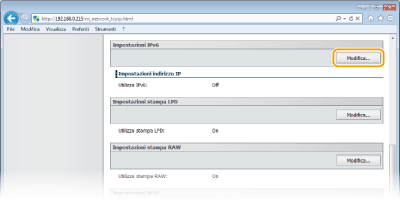 Gli indirizzi IPv6 della macchina possono essere configurati attraverso la IU remota. Prima di impostare indirizzi IPv6, verificare le impostazioni dell'indirizzo IPv4 (Visualizzazione delle impostazioni IPv4). È necessario impostare correttamente i parametri IPv4 per utilizzare gli indirizzi IPv6. Tenere presente che la funzione di scansione che utilizza il driver dello scanner o MF Toolbox non è disponibile in ambiente IPv6. La macchina può utilizzare fino a nove dei seguenti indirizzi IPv6: