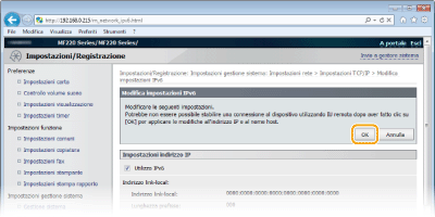 Utilizzo del pannello operativoÈ anche possibile accedere alle impostazioni IPv6 da <Menu> nella schermata principale. Impostazioni IPv6