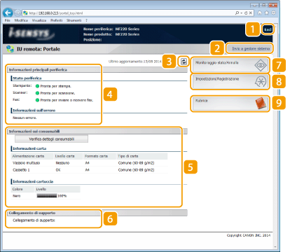Visualizza lo stato corrente della macchina e le informazioni di errore. Se si sono verificati errori, viene visualizzato il collegamento alla pagina Informazioni errore.