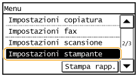 Tutte le impostazioni della stampante sono elencate con una breve descrizione. Le impostazioni predefinite sono contrassegnate con una croce (