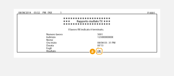 "OK" indica che la trasmissione è stata correttamente completata mentre "NG" con tre cifre (un codice di errore) indica che la trasmissione non è riuscita (