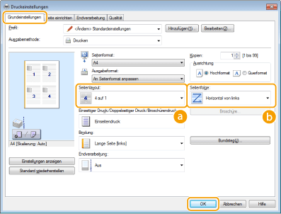 Wählen Sie in [Seitenlayout] die Anzahl der Seiten aus, die auf ein Blatt gedruckt werden sollen