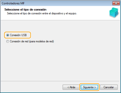 Seleccione [Conexión USB], y haga clic en [Siguiente].