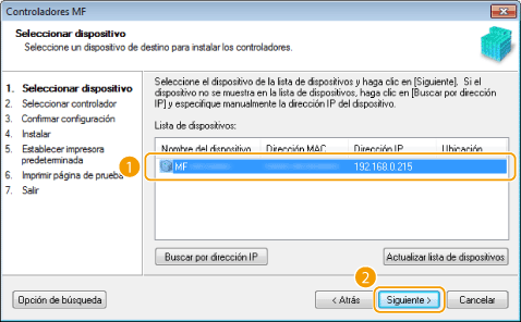Visualización de las opciones de red (e-Manual)) y haga clic en [Actualizar lista de dispositivos]. Si el equipo no aparece en absoluto, haga clic en [Buscar por dirección IP]