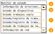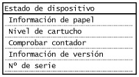 Muestra el estado del equipo, como la cantidad de papel o tóner restante.