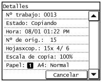Muestra el estado actual del elemento seleccionado. La pantalla <Estado trabajos copia> se muestra a continuación como ejemplo.