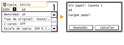La pantalla <Inicio> para iniciar operaciones y las pantallas para especificar la configuración aparecerán en la pantalla. También podrá ver el progreso de trabajos y los mensajes aquí. Pulse la pantalla para utilizarla.
