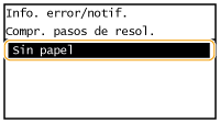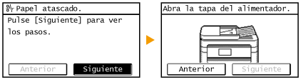 En algunos casos, cuando se produce un error, aparecen las instrucciones sobre cómo responder ante dicho error. Siga las instrucciones de la pantalla para solucionar el problema. La pantalla que aparece cuando se produce un atasco de papel se muestra a continuación a modo de ejemplo (
