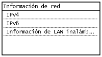 Muestra las opciones de configuración de red, como la dirección IP del equipo, así como el estado, como por ejemplo el de las comunicaciones de red inalámbrica.