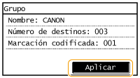 Repita los pasos 8 y 9 hasta que haya registrado todos los destinos que desee registrar y, a continuación, pulse <Aplicar>.