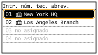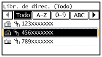 Muestra todos los destinos registrados en la libreta de direcciones. Para obtener información sobre las marcas que aparecen junto a los destinos, eche un vistazo a las siguientes explicaciones.