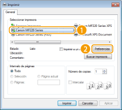 Seleccione el controlador de impresora del equipo y haga clic en [Preferencias] (o [Propiedades]).