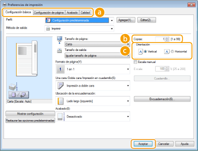 Especifique las opciones de impresión, como por ejemplo el número de copias y la orientación de impresión, y haga clic en [Aceptar].