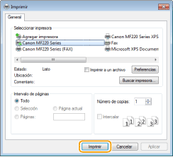 El método para mostrar el cuadro de diálogo de impresión varía según la aplicación. Para obtener más información, consulte el manual de instrucciones de la aplicación que esté utilizando.