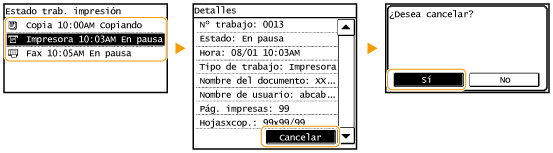 Cancelación desde la IU remotaPuede cancelar la impresión desde la página [Estado de trabajos] de la IU remota: Comprobación del estado actual de los documentos de impresión