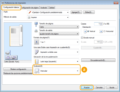 Seleccione [Intercalar] o [Agrupar] en [Acabado]