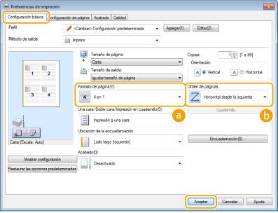En [Formato de página], seleccione el número de páginas que desee imprimir en una única hoja