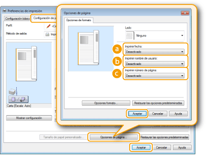 Pestaña [Configuración de página] Haga clic en [Opciones de página] Seleccione la posición de impresión de la fecha de impresión, el nombre de usuario o el número de página [Aceptar]  [Aceptar]