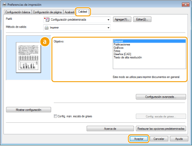 Seleccione una opción que se adapte al tipo de documento o al propósito de la impresión. Por ejemplo, seleccione [General] para el uso general, o seleccione [Fotos] cuando desee imprimir imágenes fotográficas con una calidad de impresión óptima.