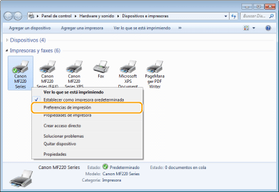 Haga clic con el botón derecho del ratón en el icono del equipo y, a continuación, haga clic en [Preferencias de impresión].