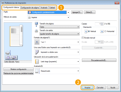 Configure las opciones de impresión de acuerdo con sus necesidades en las pestañas [Configuración básica], [Configuración de página], [Acabado] y [Calidad].