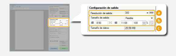 Si duplica la resolución de salida, el tamaño de los archivos de imágenes se multiplica por 4. Si el tamaño de archivo es demasiado grande, podría producirse escasez de memoria o algún otro error. Configure la resolución en el valor mínimo necesario según el uso previsto.