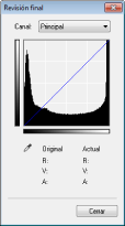 Los resultados de todos los ajustes realizados en el brillo, el contraste (  ), el histograma (  ) y las opciones de las curvas de tonos (  ) aparecen en una curva de tonos y como valores numéricos. Realice una comprobación final de las opciones de color.
