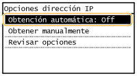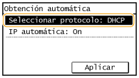 ![]() Si aparece <On>, pulse <Obtención automática> y establezca tanto <Seleccionar protocolo> como <IP automática> en <Off>.