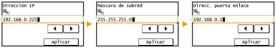 <Máscara de subred> <Direcc. puerta enlace>.Introduzca cada uno de los valores utilizando las teclas numéricas y pulse <Aplicar>.