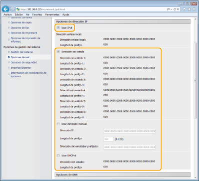 Las direcciones IPv6 del equipo pueden configurarse a través de la IU remota. Antes de configurar direcciones IPv6, compruebe las opciones de la dirección IPv4 (Visualización de las opciones de IPv4). Debe establecer las opciones de IPv4 correctas para poder utilizar direcciones IPv6. Tenga en cuenta que la función de escaneado que utiliza el controlador de escáner o MF Toolbox no está disponible en los entornos IPv6. El equipo puede utilizar hasta nueve de las siguientes direcciones IPv6:
