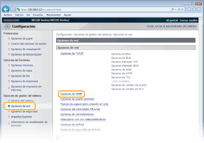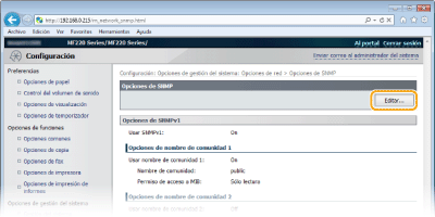 También es posible acceder a las opciones de SNMPv1 desde <Menú> en la pantalla de Inicio. Opciones de SNMP