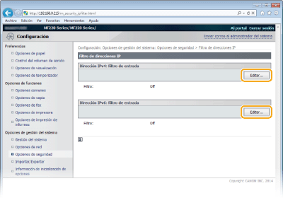 Si las direcciones IP se introducen de forma incorrecta, es posible que no pueda acceder al equipo desde la IU remota, en cuyo caso deberá establecer <Filtro direcc. IPv4> o <Filtro direcc. IPv6> en <Off>. Filtro de direcciones IPv4 Filtro de direcciones IPv6