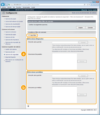 Permite la comunicación (recibida) únicamente con dispositivos que tengan registradas sus direcciones IP en [Direcciones permitidas] y restringe la comunicación con dispositivos con cualquier otra dirección IP. Sin embargo, la comunicación estará restringida para las direcciones IP que estén registradas también en [Direcciones bloqueadas].