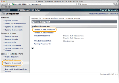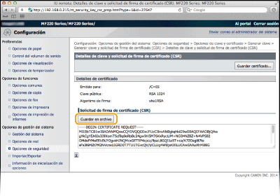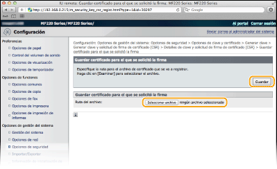 Haga clic en [Seleccionar archivo], especifique el archivo para la solicitud de firma del certificado y haga clic en [Guardar].
