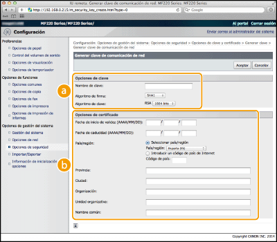 Introduzca la fecha hasta la que el certificado será válido entre 01/01/2000 y 12/31/2099. No podrá configurar fechas anteriores a [Fecha de inicio de validez (AAAA/MM/DD)].