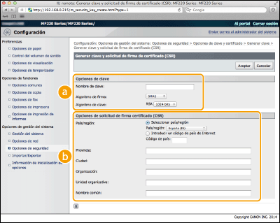 Seleccione [Clave y solicitud de firma de certificado (CSR)] y haga clic en [Aceptar].