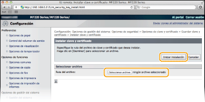 Haga clic en [Seleccionar archivo], especifique el archivo que desee instalar y haga clic en [Iniciar instalación].