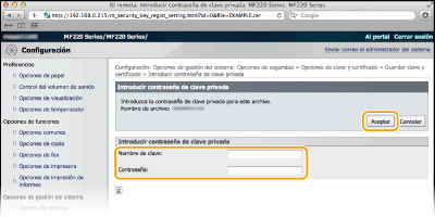 Introduzca el nombre del par de claves y la contraseña y, a continuación, haga clic en [Aceptar].