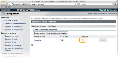 [Opciones de clave y certificado] (para los pares de claves) u [Opciones de certificado de CA] (para los certificados de CA).