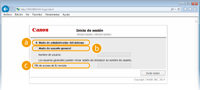 Podrá realizar todas las operaciones y configuraciones de la IU remota. Introduzca el PIN adecuado en [PIN del administrador del sistema] (