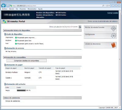Para utilizar el equipo de forma remota, debe introducir la dirección IP del equipo en un navegador web e iniciar la IU remota. Compruebe la dirección IP establecida en el equipo previamente (