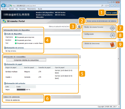 Muestra el enlace de asistencia especificado en [Información del dispositivo] debajo de [Gestión del sistema].