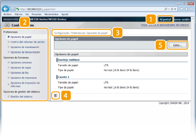 Muestra la página [Configuración]. Cuando haya iniciado sesión en el modo Administrador del Sistema, podrá cambiar los elementos de configuración y guardar/cargar los datos registrados.