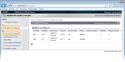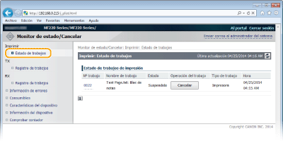 Haga clic en [Nº trabajo] en los documentos pausados para ver información detallada. Podrá consultar el nombre de usuario y el número de páginas del documento impreso.
