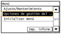 Todas las opciones de gestión del sistema se muestran con descripciones breves. Las opciones predeterminadas aparecen marcadas con una cruz (  ).