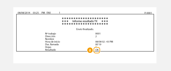 "OK" indica que la transmisión finalizó correctamente, mientras que "NG" y tres dígitos (código de error) indica que la transmisión no se realizó correctamente (