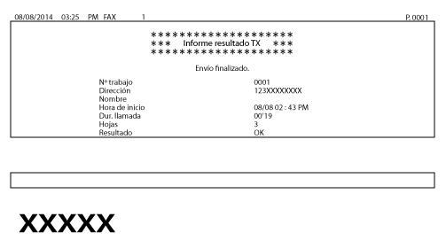 Podrá comprobar los registros de fax o los documentos recibidos imprimiendo un Informe de resultados de RX. El informe podrá imprimirse cada vez que finalice una transmisión o únicamente cuando se produzca un error de transmisión.