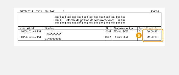 Podrá consultar los registros de fax de los documentos enviados y recibidos imprimiendo un Informe de gestión de comunicaciones. El informe puede imprimirse automáticamente cada 40 transmisiones, o lo podrá imprimir manualmente.